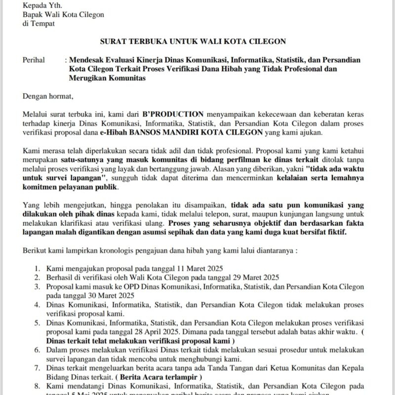 Melansir dari pemberitaan cilegonsatu.id (06/05/2025), Difliandi, Ketua B’Production, bilang, “Proposal kami ditolak dengan alasan tidak ada waktu untuk survei lapangan. Ini mengindikasikan lemahnya komitmen pelayanan publik.” ungkapnya.Surat terbuka mereka juga mengungkap kronologi yang bikin geleng-geleng kepala, proposal diajukan sejak 11 Maret, diverifikasi Wali Kota pada 29 Maret, tapi baru diverifikasi dinas pada 28 April.